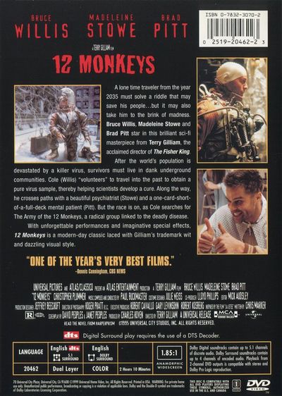 A lone time traveler from the year 2035 must solve a riddle that may save his people...but it may take him to the brink of madness. Bruce Willis, Madeleine Stowe and Brad Pitt star in this brilliant sci-fi masterpiece from Terry Gilliam, the acclaimed director of 'The Fisher King'.After the world's population is devastated by a killer virus, survivors must live in the dank underground communities. Cole (Willis) "volunteers" to travel into the past to obtain a pure virus sample, thereby helping scientists develop a cure. Along the way, he crosses paths with a beautiful psychiatrist (Stowe) and a one-card-short-of-a-full-deck mental patient (Pitt). But the race is on, as Cole searches for The Army Of The 12 Monkeys, a radical group linked to the deadly disease. With unforgettable performances and imaginative special effects, '12 Monkeys' is a modern-day classic laced with Gilliam's trademark wit and dazzling visual style.