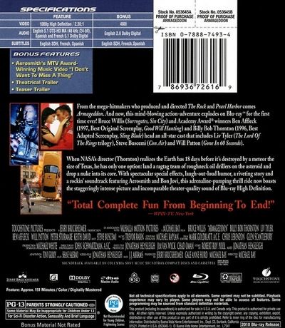From mega-hitmakers who produced and directed The Rock and Pearl Harbor comes Armageddon. And now, this mind-blowing action-adventure explodes on Blu-ray™ for the first time ever! Bruce Willis (Surrogates, Sin City) and Academy Award® winners Ben Affleck (1997, Best Original Screenplay, Good Will Hunting) and Billy Bob Thornton (1996, Best Adapted Screenplay, Sling Blade) head an all-star cast that includes Liv Tyler (The Lord of the Rings trilogy), Steve Buscemi (Con Air) and Will Patton (Gone in 60 Seconds).When NASA's director (Thornton) realizes the Earth has 18 days before it's destroyed by a meteor the size of Texas, he has only one option: land a ragtag team of roughneck oil drillers on the asteroid and drop a nuke into its core. With spectacular special effects, laugh-out-loud humor, a riveting story and a rockin' soundtrack featuring Aerosmith and Bon Jovi, this adrenaline-pumping thrill ride now boasts the staggeringly intense picture and incomparable theater-quality sound of Blu-ray High Definition. |