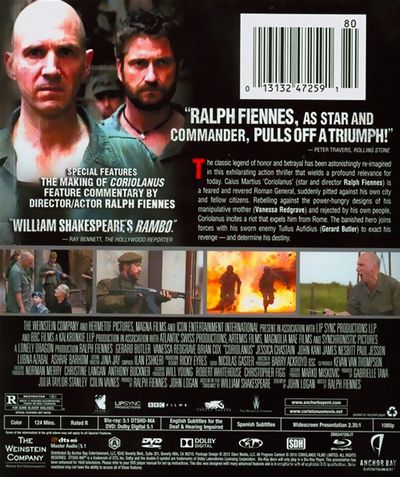 The classic legend of honor and betrayal has been astonishingly re-imagined in this exhilarating action thriller that wields a profound relevance for today. Caius Martius 'Coriolanus' (star and director Ralph Fiennes) is a feared and revered Roman General, suddenly pitted against his own city and fellow citizens. Rebelling against the power-hungry designs of his manipulative mother (Vanessa Redgrave) and rejected by his own people, Coriolanus incites a riot that expels him from Rome. The banished hero joins forces with his sworn enemy Tullus Aufidius (Gerard Butler) to extract his revenge - and determine his destiny. |