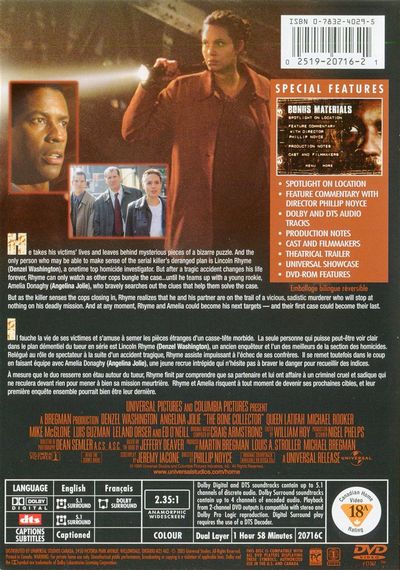 He takes his victims' lives and leaves behind mysterious pieces of a bizarre puzzle. And the only person who may be able to make sense of the serial killer's deranged plan is Lincoln Rhyme (Denzel Wahington), a onetime top homicide investigator. But after a tragic accident changes his life forever, Rhyme can only watch as other cops bungle the case...until he teams up with a young rookie, Amelia Donaghy (Angelina Jolie), who bravely searches out the clues that help them solve the case.But as the killer senses the cops closing in, Rhyme realizes that he and his partner are on the trial of a vicious, sadistic murderer who will stop at nothing on his deadly mission. And at any moment, Rhyme and Amelia could become his next targets - and their first case could become their last.Il fauche la vie des ses victimes et s'amuse à semer les pièces étranges d'un casse-tête morbide. La seule personne qui puisse peut-être voir clair dans le plan démentiel du tueur en série est Lincoln Rhyme (Denzel Wahington), un ancien enquêteur et l'un des meilleurs de la section des homicides. Relégué au rôle de spectateur à la suite d'un accident tragique, Rhyme assiste impuissant à l'échec de ses confrères. Il se remet toutefois dans le coup en faisant èquipe avec Amelia Donaghy (Angelina Jolie), une jeune recrue intrépide qui n'hésite pas à braver pour recueillir des indices.À mesure que le duo resserre son étau autour du tueur, Rhyme finit par comprendre que sa partenaire et lui ont affaire à un criminal cruel et sadique qui ne reculera devant rien pour mener à bien sa mission meurtrière. Rhyme et Amelia risquent à tout moment de devenir ses prochaines cibles, et leur première enquête ensemble pourrait bien être leur dernière.