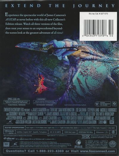 Experience the spectacular world of James Cameron's AVATAR as never before with this all-new Collector's Edition release. Watch the extended version of the film, then treat your senses to an unprecedented beyond-the-senses look at the greatest adventure of all time.Experience the complete filmmaker's journey with 3 discs and 3 versions of the film!Includes Original Theatrical Version, Special Edition Re-Release & All-New 3-Hour Collector's Extended Cut with 16 Minutes of Additional Footage |