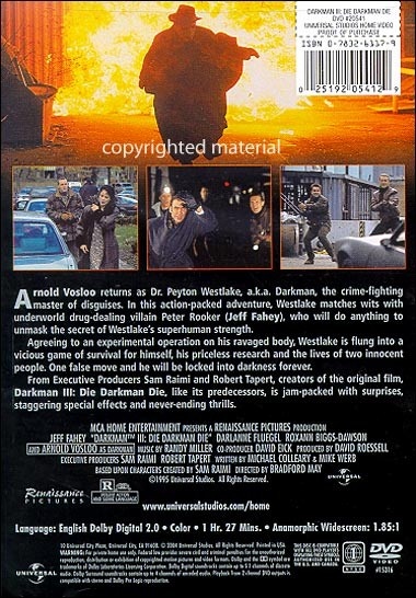 Arnold Vosloo returns as Dr. Peyton Westlake, a.k.a. Darkman, the crime-fighting master of disguises. In this action-packed adventure, Westlake matches wits with underworld drug-dealing villain Peter Rooker (Jeff Fahey), who will do anything to unmask the secret of Westlake's superhuman strength.Agreeing to an experimental operation on his ravaged body, Westlake is flung into a vicious game of survival for himself, his priceless research and the lives of two innocent people. One false move and he will be locked into darkness forever.From Executive Producers Sam Raimi and Robert Tapert, creators of the original film, Darkman III: Die Darkman Die, like its predecessors, is jam-packed with surprises, staggering special effects and never-ending thrills.System Requirements: Running Time 87 MinFormat: DVD MOVIE |