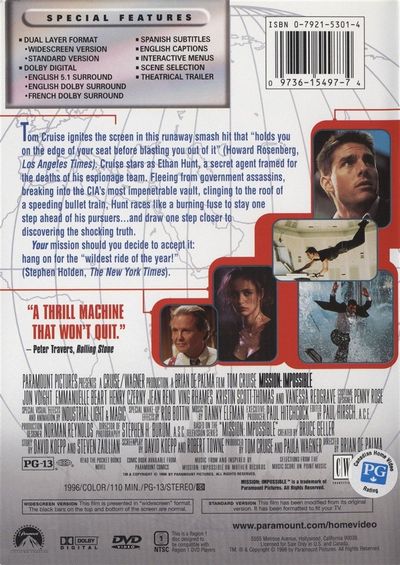 Tom Cruise ignites the screen in this runaway smash hit that "holds you on the edge of your seat before blasting you out of it" (Howard Rosenberg, Los Angeles Times). Cruise stars as Ethan Hunt, a secret agent framed for the deaths of his espionage team. Fleeing from government assassins, breaking into the CIA's most impenetrable vault, clinging to the roof of a speeding bullet train, Hunt races like a burning fuse to stay one step ahead of his pursuers...and draw one step closer to discovering the shocking truth.Your mission should you decide to accept it: hang on for the "wildest ride of the year!" (Stephen Holden, The New York Times). |