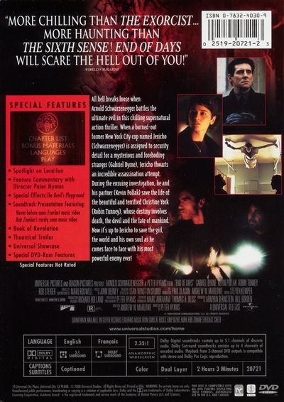 All hell breaks loose when Arnold Schwarzenegger battles the ultimate evil in this chilling supernatural action thriller. When a burned-out former New York City cop named Jericho (Schwarzenegger) is assigned to security detail for a mysterious and foreboding stranger (Gabriel Byrne), Jericho thwarts an incredible assassination attempt. During the ensuing investigation, he and his partner (Kevin Pollak) save the life of the beautiful and terrified Christine York (Robin Tunney), whose destiny involves death, the devil and the fate of mankind. Now it's up to Jericho to save the girl, the world and his own soul as he comes face to face with his most powerful enemy ever! |