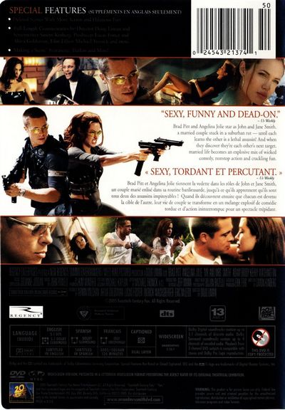 Brad Pitt and Angelina Jolie star as John and Jane Smith, a married couple stuck in a suburban rut - until each learns the other is a lethal assassin! And when they discover they're each other's next target, married life becomes an explosive mix of wicked comedy, nonstop action and crackling fun.----------------------------------------Brad Pitt et Angelina Jolie tiennent la vedette dans les rôles de John et Jane Smith, un couple marié enlisé dans sa routine banlieusarde, jusqu'à ce qu’ils apprennent qu’ils sont tous deux des assassins impitoyables! Quand ils découvrent ensuite que chacun est devenu la cible de l’autre, leur vie de couple se transforme en un mélange explosif de comédie tordue et d’action ininterrompue pour un spectacle trépidant. |