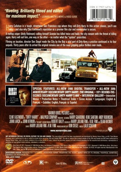 Detective Harry Callahan. He doesn't break murder cases. He smashes them.Harry Callahan is a tough, streetwise San Francisco cop whom they call Dirty Harry. In this action classic, you'll see why-and also why Clint Eastwood's reputation as a premier film star and moviemaker is secure.A rooftop sniper (Andy Robinson) calling himself Scorpio has killed twice and holds the city ransom with the threat of killing again. Harry will nail him one way or the other-no matter what the "system" prescribes.Filming on location, director Don Siegel made the City by the Bay a vital part of Dirty Harry, a practice continued in its four sequels. The original remains one of the most gripping police thrillers ever made. |
