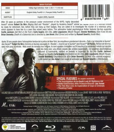 After 30 years as partners in the pressure cooker environment of the NYPD, highly decorated Detectives "Turk", played by Academy Award winner Robert De Niro (Raging Bull) and "Rooster", played by Academy Award winner Al Pacino (Scent Of A Women) should be ready for retirement. But, before they can hang up their badges, they are called in to investigate the murder of a notorious pimp, which appears to have ties to a case they solved years before. This adrenaline fueled psychological thriller features hip-hop superstar Curtis Jackson (Get Rich Or Die Tryin'), Carla Gugino (Sin City), John Leguizamo (Moulin Rouge!), Donnie Wahlberg (Saw II and III) and Brian Dennehy (Death Of A Salesman) and was directed by Jon Avnet (Red Corner) and written by Russell Gewirtz (Inside Man). |
