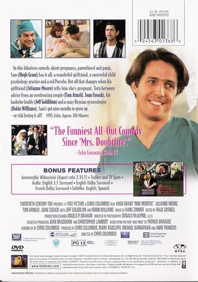 Sam (Hugh Grant) has it all - a wonderful girlfriend, a successful child psychology practice and a red Porsche. But he's faced with having something he never wanted when he learns his girlfriend (Julianne Moore) is expecting. The news sends the unflappable psychologist into a panic. Torn between advise given by a well-meaning but over-bearing couple, (Tom Arnold and Joan Cusack), and by his confirmed bachelor buddy (Jeff Goldblum), Sam's in serious danger of losing his mind and his girlfriend. He's got just nine months - give or take a week, according to their crazy Russian gynecologist (Robin Williams) - to grow up! |