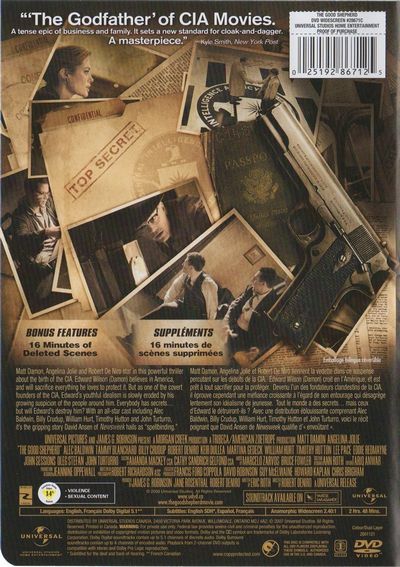 Matt Damon, Angelina Jolie and Robert De Niro star in this powerful thriller about the birth of the CIA. Edward Wilson (Damon) believes in America, and will sacrifice everything he loves to protect it. But as one of the covert founders of the CIA, Edward’s youthful idealism is slowly eroded by his growing suspicion of the people around him. Everybody has secrets...but will Edward’s destroy him? With an all-star cast including Alec Baldwin, Billy Crudup, William Hurt, Timothy Hutton and John Turturro, it’s the gripping story David Ansen of Newsweek hails as "spellbinding." |