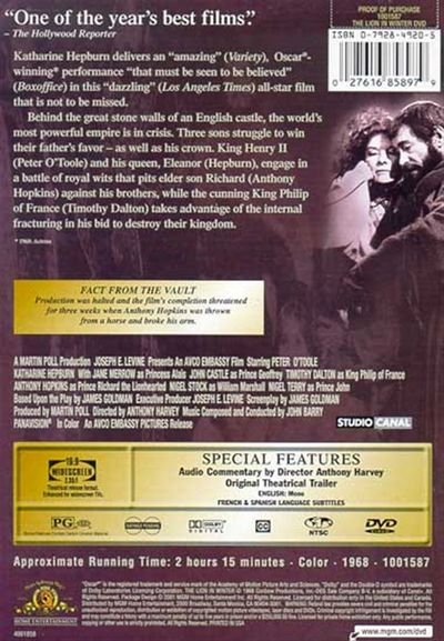 Katharine Hepburn delivers an "amazing" (Variety), Oscar®-winning performance "that must be seen to be believed" (Boxoffice) in this "dazzling" (Los Angeles Times) all-star film that is not to be missed.Behind the great stone walls of an English castle, the world's most powerful empire is in crisis. Three sons struggle to win their father's favor - as well as his crown. King Henry II (Peter O'Toole) and his queen, Eleanor (Hepburn), engage in a battle of royal wits that pits elder son Richard (Anthony Hopkins) against his brothers, while the cunning King Philip of France (Timothy Dalton) takes advantage of the internal fracturing in his bid to destroy their kingdom.