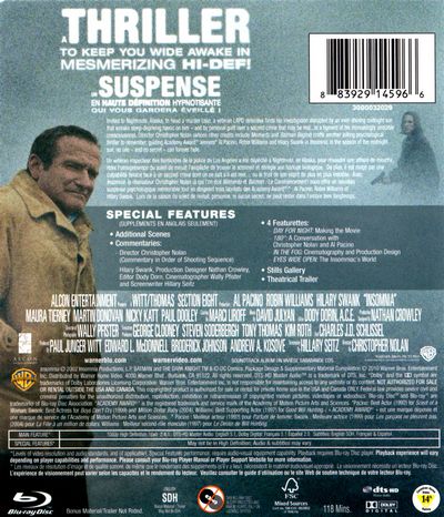 Invited to Nightmute, Alaska, to head a murder case, veteran LAPD detective Will Dormer finds his investigation interrupted by an ever-shining midnight sun that wreaks sleep-depriving havoc on him- and by personal guilt over a second crime that may be real...or a figment of his increasingly unstable consciousness.Director Christopher Nolan (Memento) crafts another jolting psychological thriller to remember, guiding Academy Award winners Al Pacino, Robin Williams, and Hilary Swank in Insomnia. In the season of the midnight sun, no one - and no secret - can hide forever. |