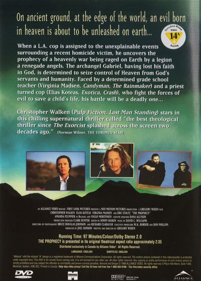On ancient ground, at the edge of the world, an evil born in heaven is about to be unleashed on earth....When a L.A. cop is assigned to the unexplainable events surrounding a recent homicide victim, he uncovers the prophecy of a heavenly war being raged on Earth by a legion of renegade antels. The archangel Gabriel, having lost his faith in God, is determined to seize control of Heaven from God's servants and humanity. Faced by a determined grade school teacher (Virginia Madsen, Candyman, The Rainmaker) and a priest turned cop (Elias Koteas, Exotica, Crash), who fight the forces of evil to save a child's life, his battle will be a deadly one...Christopher Walken (Pulp Fiction, Last Man Standing) stars in this chilling supernatural thriller called "The best theological thriller since The Exorcist splashed across the screen two decades ago." (norman Wilner, The Toronto Star) |