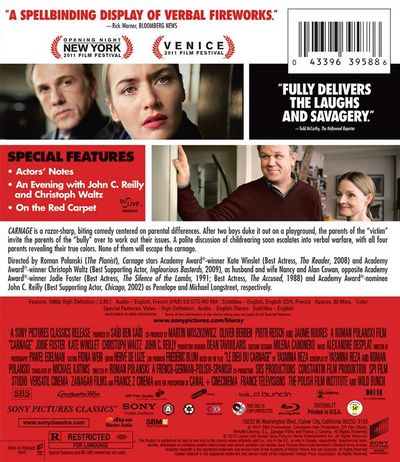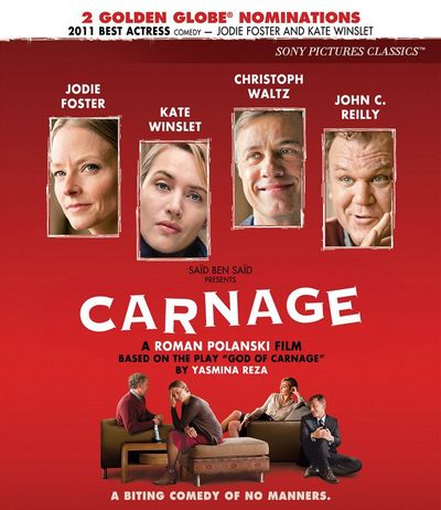 Carnage is a razor-sharp, biting comedy centered on parental differences. After two boys duke it out on a playground, the parents of the "victim" invite the parents of the "bully" over to work out the issues. A polite discussion of childrearing soon escalates into verbal warfare, with all four parents revealing their true colors. None of them will escape the carnage.Directed by Roman Polanski (The Pianist), Carnage stars Academy Award®-winner Kate Winslet (Best Actress, The Reader, 2008) and Academy Award®-winner Christopher Waltz (Best Supporting Actor, Inglorious Basterds, 2009), as husband and wife Nancy and Alan Cowan, opposite Academy Award®-winner Jodie Foster (Best Actress, The Silence of the Lambs, 1991; Best Actress, The Accused, 1988) and Academy Award®-nominee John C. Reilly (Best Supporting Actor, Chicago, 2002) as Penelope and Michael Longstreet, respectively.