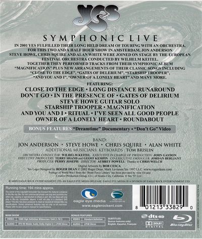 In 2001 Yes fulfilled their long held dream of touring with an orchestra. For this two and a half hour show in Amsterdam, Jon Anderson, Steve Howe, Chris Squire, and Alan White were joined on stage by the European Festival Orchestra conducted by Wilhelm Keitel. Together they performed tracks from their symphonic album "Magnification" plus new arrangements of their classic songs including "Close to the Edge", "Gates of Delerium", " Starship Trooper", "And You and I", "Owner of a Lonely Heart", and many more.