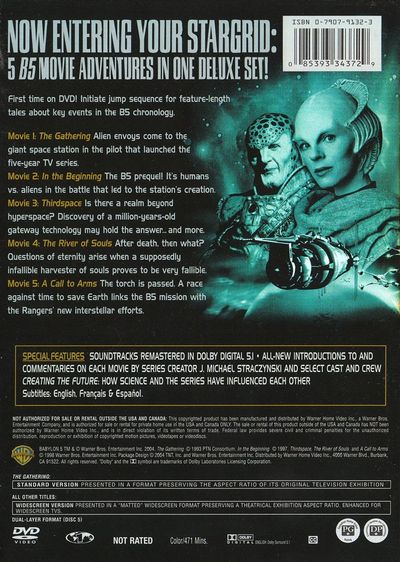 Movie 1: The GatheringAlien envoys come to the giant space station in the pilot that launched the five-year TV series.Movie 2: In The BeginningThe B5 prequel! It's humans vs. aliens in the battle that led to the station's creation.Movie 3: ThirdspaceIs there a realm beyond hyperspace? Discovery of a million-years-old gateway technology may hold the answer...and more.Movie 4: The River Of SoulsAfter death, then what? Questions of eternity arise when a supposedly infallible harvester of souls proves to be very fallible.Movie 5: A Call To ArmsThe torch is passed. A race against time to save Earth links the B5 mission with the Rangers' new interstellar efforts. |