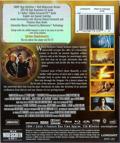 When Professor Daniel Jackson (James Spader) innocently accepts the offer of a mysterious woman to decode an ancient Egyptian artifact know only as the Stargate, he unwittingly takes the first step on an epic adventure that will span the galaxies and decide the fate of an entire planet. Colonel Jack O'Neil (Kurt Russell) a true soldier with nerves of steel and a tragic past, is brought back to active duty to commandeer the first trip through the Stargate. On a desert planet on the far side of the universe, Jackson and O'Neil must battle the powerful alien Sun God, Ra (Jaye Davidson). At stake: the freedom of an ancient civilization from slavery and any chance of ever getting home! |