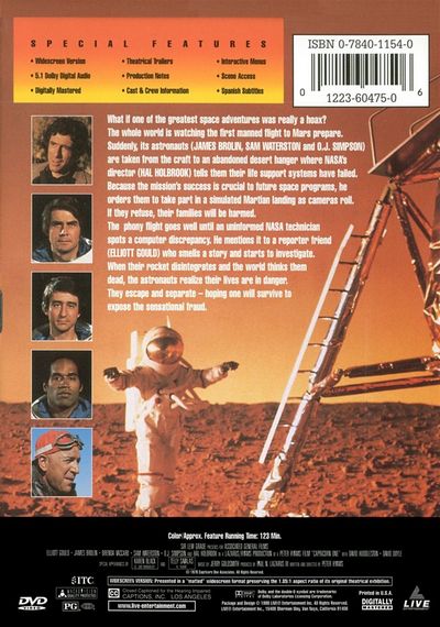 What if one of the greatest space adventures was really a hoax? The whole world is watching the first manned flight to Mars prepare. Suddenly, its astronauts are taken from the craft to an abandoned desert hanger where NASA's director tells them their life support systems have failed. Because of the mission's success is crucial to future space programs, he orders them to take part in a simulated Martian landing as cameras roll. If they refuse, their families will be harmed.The phony flight goes well until an uninformed NASA technician spots a computer discrepency. He mentions it to a reporter friend who smells a story and starts to investigate. When their rocket disintegrates and the world thinks them dead, the astronauts realize their lives are in danger. They escape and separate- hoping one of them will survive to expose the sensational fraud.