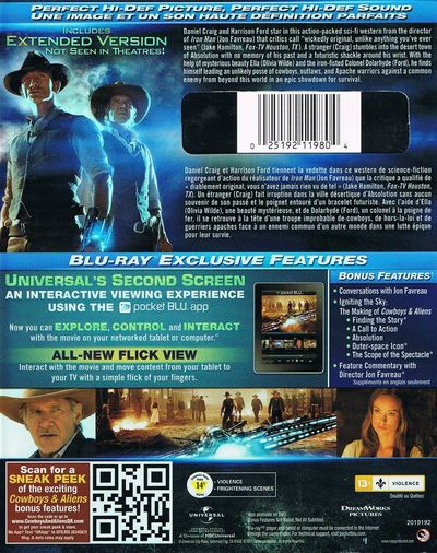 Daniel Craig and Harrison Ford star in this action-packed sci-fi western from the director of Iron Man (Jon Favreau) that critics call "wickedly original, unlike anything you've ever seen" (Jake Hamilton, Fox-TV Houston, TX). A stranger (Craig) stumbles into the desert town of Absolution with no memory of his past and a futuristic shackle around his wrist. With the help of mysterious beauty Ella (Olivia Wilde) and the iron-fisted Colonel Dolarhyde (Ford), he finds himself leading an unlikely posse of cowboys, outlaws, and Apache warriors against a common enemy from beyond this world in an epic showdown for survival.Daniel Craig et Harrison Ford tiennent la vedette dans ce western de science-fiction regorgeant d'action du réalisateur de Iron Man (Jon Favreau) que la critique a qualifié de « diablement original, vous n'avez jamais rien vu de tel » (Jake Hamilton, Fox-TV Houston, TX). Un étranger (Craig) fait irruption dans la ville désertique d'Absolution sans aucun souvenir de son passé et le poignet entouré d'un bracelet futuriste. Avec l'aide d'Ella (Olivia Wilde), une beauté mystérieuse, et de Dolarhyde (Ford), un colonel a la poigne de fer, it se retrouve à la tête d'une troupe improbable de cowboys, de hors-la-loi et de guerriers apaches face à un ennemi commun d'un autre monde dans une lutte épique pour leur survie.
