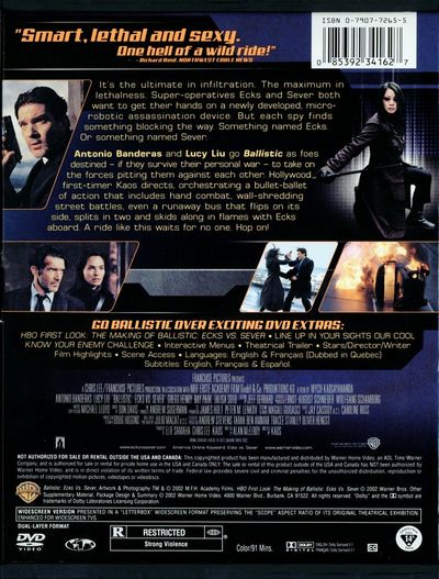 Its the ultimate in infiltration. The maximum in lethalness. Super-operatives Ecks and Sever both want to get their hands on a newly developed micro-robotic assassination device. But each spy finds something blocking the way. Something named Ecks. Or something named Sever.Antonio Banderas and Lucy Liu go Ballistic as foes destined - if they survive their personal war - to take on the forces pitting them against each other. Hollywood first-timer Kaos directs, orchestrating a bullet-ballet of action that includes hand combat, wall shredding street battles, even a runaway bus that flips on its side, splits in two and skids along in flames with Ecks aboard. A ride line this waits for no one. Hop on! |