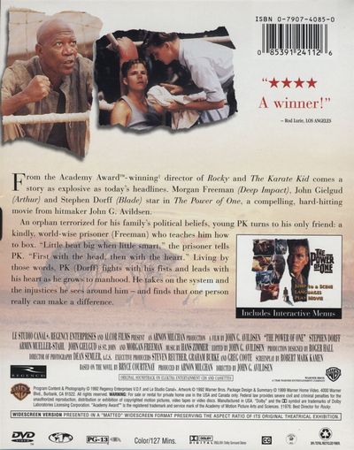 The Power of One is an intriguing story of a young English boy named P.K. and his passion for changing the world. Growing up he suffered as the only English boy in an Afrikaans school. Soon orphaned, he was placed in the care of a German national named Professor von Vollensteen (a.k.a. "Doc"), a friend of his grandfather. Doc develops P.K.'s piano talent and P.K. becomes "assistant gardener" in Doc's cactus garden. It is not long after WWII begins that Doc is placed in prison for failure to register with the English government as a foreigner. P.K. makes frequent visits and meets Geel Piet, an inmate, who teaches him to box. Geel Piet spreads the myth of the Rainmaker, the one who brings peace to all of the tribes. P.K. is cast in the light of this myth. After the war P.K. attends an English private school where he continues to box. He meets a young girl, Maria, with whom he falls in love. Her father, Professor Daniel Marais, is a leader of the Nationalist Party of South Africa. The two fight to teach the natives English as P.K.'s popularity grows via the myth. Maria is killed. P.K. looses focus until he sees the success of his language school among the tribes. He and Guideon Duma continue the work in hopes of building a better future for Africa.