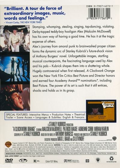 Stomping, whomping, stealing, singing, tap-dancing, violating. Derby-topped teddy-boy hooligan Alex (Malcolm McDowell) has his own way of having a good time. He has it at the tragic expense of others.Alex's journey from amoral punk to brainwashed proper citizen forms the dynamic arc of Stanley Kubrick's future-shock vision of Anthony Burgess' novel. Unforgettable images, startling musical counterpoints, the fascinating languag used by Alex and his pals - Kubrick shapes them into a shattering whole. Hugely controversial when first released, A Clockwork Orange won the New York Film Critics Best Picture and Director honors and earned four Academy Award nominations, including Best Picture. The power of its art is such that it still entices, shocks and holds us in its grasp.
