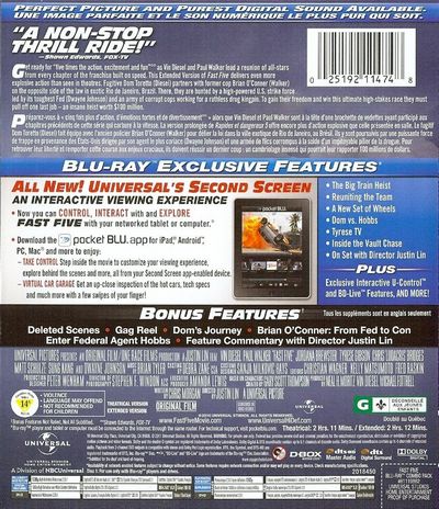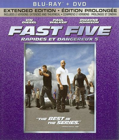Get ready for “five times the action, excitement and fun” as Vin Diesel and Paul Walker lead a reunion of all-stars from every chapter of the franchise built on speed. This Extended Version of Fast Five delivers even more explosive action than seen in theaters. Fugitive Dom Toretto (Diesel) partners with former cop Brian O’Conner (Walker) on the opposite side of the law in exotic Rio de Janeiro, Brazil. There, they are hunted by a high-powered U.S. strike force led by its toughest Fed (Dwayne Johnson) and an army of corrupt cops working for a ruthless drug kingpin. To gain their freedom and win this ultimate high-stakes race they must pull off one last job - an insane heist worth $100 million.Préparez-vous a "cinq fois plus d'action, d'émotions fortes et de divertissement", alors que Vin Diesel et Paul Walker sont à la tète d'une brochette de vedettes ayant participé aux chapitres précédents de cette série qui carbure à la vitesse. La version prolongée de Rapides et Dangereux 5 offre encore plus d'action explosive que celle présentée en salle. Le fugitif Dom Toretto (Diesel) fait équipe avec l'ancien policier Brian O'Conner (Walker) pour défier la loi dans la ville exotique de Rio de Janeiro, au Brésil. Ils y sont poursuivis par une puissante force de frappe en provenance des États-Unis dirigée par son agent le plus coriace (Dwayne Johnson) et une armée de flics corrompus à la solde d'un impitoyable pilier de la drogue. Pour retrouver leur liberté et remporter cette course aux enjeux cruciaux, ils doivent réussir un dernier coup: un cambriolage qui pourrait leur rapporter 100 millions de dollars.