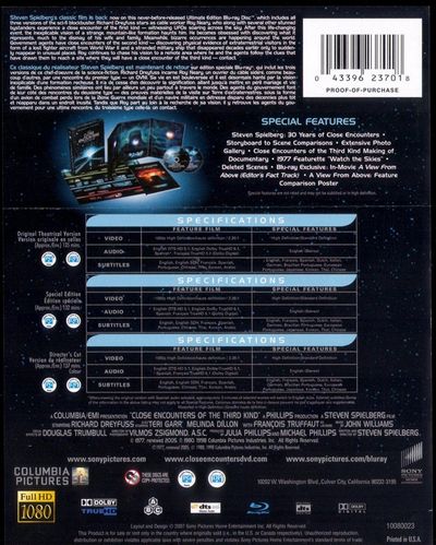 Steven Spielberg's classic film is back now on this never-before-released Ultimate Edition Blu-ray Disc, which includes all three versions of the sci-fi blockbuster. Richard Dreyfuss stars as cable worker Roy Neary, who along with several other stunned bystanders experience a close encounter of the first kind - witnessing UFOs soaring across the sky. After this life-changing event, the inexplicable vision of a strange, mountain-like formation haunts him. He becomes obsessed with discovering what it represents, much to the dismay of his wife and family. Meanwhile, bizarre occurrences are happening around the world. Government agents have close encounters of the second kind - discovering physical evidence of extraterrestrial visitors in the form of a lost fighter aircraft from World War II and a stranded military ship that disappeared decades earlier only to suddenly reappear in unusual places. Roy continues to chase his vision to a remote area where he and the agents follow the clues that have drawn them to reach a site where they will have a close encounter of the third kind - contact.