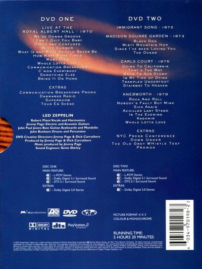 Atlantic Records are proud to announce a landmark event in music history - the release of the mother lode of Led Zeppelin live recordings: 'Led Zeppelin DVD', a two disc set. This marks the first official release of these legendary performances.Clocking in at nearly five and a half hours, 'Led Zeppelin DVD' has been culled from the few performances which were never filmed during the band's lifetime: London's Royal Albert Hall in January 1970, just one year after the release of their debut album; their triumphant five night run at London's Earl's Court in May 1975; and their record breaking shows at England's Knebworth Festival in August 1979; just one year before the death of drummer John Bonham. Also included are songs from Madison Square Garden in July 1973.Disc 1:Live at the Royal Albert Hall - 1969Songs included:We're Gonna GrooveCan't Quit You BabeDazed and ConfusedWhite SummerWhat Is and Should Never BeHow Many More timesMoby DickWhole Lotta LoveCommunication BreakdownC'mon EverybodySomething ElseBring it on HomeDisc 2:Splodge Edit (Live) - 1972:Immigrant SongMadison Square Garden - 1973:Black DogMisty Mountain HopSince I Been Lovin YouThe OceanEarls Court - 1975:Going to CaliforniaThat's the WayBron Y Aur StompIn My Time of DyingTrampled UnderfootStairway to HeavenLive At Knebworth - 1979:Rock N RollNobody's Fault But MineSick AgainAchilles Last StandIn the EveningKashmirWhole Lotta Love