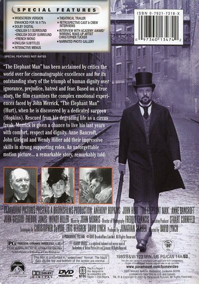 "The Elephant Man" has been acclaimed by critics the world over for cinematographic excellence and for its outstanding story of the triumph of human dignity over ignorance, prejudice, hatred and fear. Based on a true story, the film examines the complex emotional experiences faced by John Merrick, "The Elephant Man" (Hurt, when he is discovered by a dedicated surgeon (Hopkins). Rescued from his degrading life as a circus freak, Merrick is given a chance to live his last years with comfort, respect and dignity. Anne Bancroft, John Gielgud and Wendy Hiller add their impressive skills in strong supporting roles. An unforgettable motion picture...a remarkable story, remarkably told. |