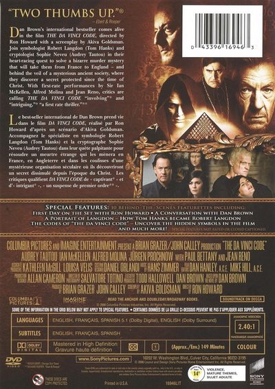 Dan Brown's international bestseller comes alive in the film 'THE DA VINCI CODE', directed by Ron Howard with a screenplay by Akiva Goldsman. Join symbologist Robert Langdon (Academy Award® Winner Tom Hanks, 1993 Best Actor, 'Philadelphia', and 1994 Best Actor, 'Forrest Gump') and cryptologist Sophie Neveu (Audrey Tautou) in their heart-racing quest to solve a bizarre murder mystery that will take them from France to England - and behind the veil of a mysterious ancient society, where they discover a secret protected since the time of Christ. With first-rate performances by Sir Ian McKellen, Alfred Molina and Jean Reno, critics are calling 'THE DA VINCI CODE' "involving" and "intriguing," "a first rate thriller."Le best-seller international de Dan Brown prend vie dans le film DA VINCI CODE, realise par Ron Howard d;apres un scenario d'Akiva Goldsman. Accompagnez le specialiste en symbologie Robert Langdon (Tom Hanks) et la cryptographe Sophie Neveu (Audrey Tautou) dans leur quete palpitante pour resoudre un meurtre etrange qui les menera en France, en Angleterre et dans les coulisses d'une mysterieuse organisation seculaire ou ils decouvriront un secret dissimule depuis l'epoque du Christ. Les critiques qualifient DA VINCI CODE de "captivant" et d'intrigant, un suspense de premier ordre.