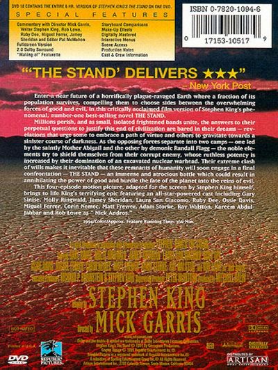 Enter a near future of a horrifically plague-ravaged Earth where a fraction of its population survives, compelling them to choose sides between the overwhelming forces of good and evil, in this critically acclaimed film version of Stephen King's phenomenal, number-one best-selling novel The Stand.Millions perish, and as small, isolated frightened bands unite, the answers to their perpetual questions to justify this end of civilization are bared in their dreams - revelations that urge some to embrace a path of virtue and others to gravitate towards a sinister course of darkness. As the opposing forces separate into two camps - one led by the saintly Mother Abigail and the other demonic Randall Flagg - the noble elements try to shield themselves from their corrupt enemy, whose ruthless potency is increased by their domination of an excavated nuclear warhead. Their extreme clash of wills makes it inevitable that these remnants of humanity will soon engage in a final confrontation - The Stand - an immense and atrocious battle which could result in annihilating the power of good and hurdle the fate of the planet into the reins of evil.This four-episode motion picture, adapted for the screen by Stephen King himself, brings to life King's terrifying epic featuring an all-star powered cast including Gary Sinise, Molly Ringwald, Jamey Sheridan, Laura San Giacomo, Ruby Dee, Ossie Davis, Kareem Adul-Jabbar and Rob Lowe as "Nick Andros." |
