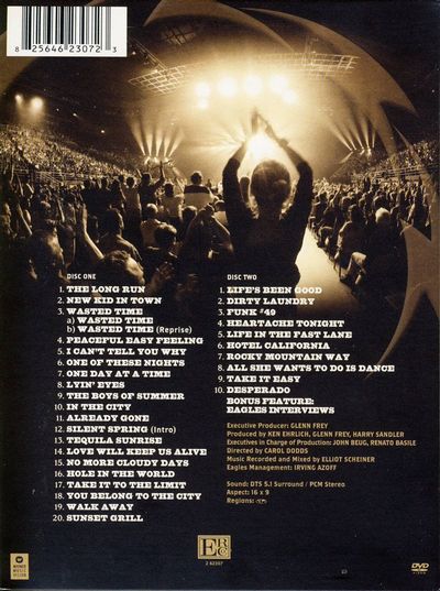 DISC ONE1. THE LONG RUN2. NEW KID IN TOWN3. WASTED TIME a) WASTED TIME b) WASTED TIME (Reprise)4. PEACEFUL EASY FEELING5. I CAN'T TELL YOU WHY6. ONE OF THESE NIGHTS7. ONE DAY AT A TIME8. LYIN' EYES9. THE BOYS OF SUMMER10. IN THE CITY11. ALREADY GONE12. SILENT SPRING (Intro)13. TEQUILA SUNRISE14. LOVE WILL KEEP US ALIVE15. NO MORE CLOUDY DAYS16. HOLE IN THE WORLD17. TAKE IT TO THE LIMIT18. YOU BELONG TO THE CITY19. WALK AWAY20. SUNSET GRILLDISC TWO1. LIFE'S BEEN GOOD2. DIRTY LAUNDRY3. FUNK #494. HEARTACHE TONIGHT5. LIFE IN THE FAST LANE6. HOTEL CALIFORNIA7. ROCKY MOUNTAIN WAY8. ALL SHE WANTS TO DO IS DANCE9. TAKE IT EASY10. DESPERADO |