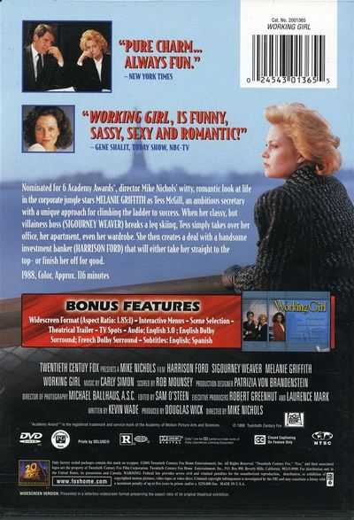 Nominated for 6 Academy Awards®, director Mike Nichols' witty, romantic look at life in the corporate jungle stars MELANIE GRIFFITH as Tess McGill, an ambitious secretary with a unique approach for climbing the ladder to success. When her classy, but villainess boss (SIGOURNEY WEAVER) breaks a leg skiing, Tess simply takes over her office, her apartment, even her wardrobe. She then creates a deal with a handsome investment banker (HARRISON FORD) that will either take her straight to the top - or finish her off for good. |