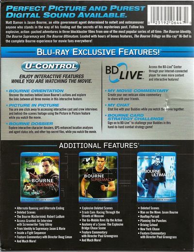 Matt Damon is Jason Bourne, an elite government agent determined to outwit and outmaneuver anyone who stands in the way of his finding out the secrets of his mysterious past. Follow his explosive, action-packed adventures in three blockbuster films from one of the most popular series of all time: The Bourne Identity, The Bourne Supremacy and the Bourne Ultimatum. Loaded with hours of bonus features, The Bourne Trilogy on Blu-ray Hi-Def is the complete Bourne experience for movie fans everywhere! |