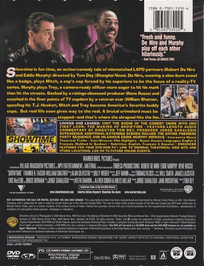 Lights. Camera. Aggravation.Showtime is fun time, an action/comedy tale of mismatched LAPD partners (Robert De Niro and Eddie Murphy) directed by Tom Dey (Shanghai Noon). De Niro, wearing a slow-burn scowl like a badge, plays Mitch, a cop's cop forced by his superiors to be the focus of a reality TV series. Murphy plays Trey, a camera-ready officer more eager to hit his mark than hit the streets. Backed by a ratings-obsessed producer (Rene Russo) and coached in the finer points of copdom by a veteran star (William Shatner, spoofing his T.J. Hooker), Mitch and Trey become America's favorite buddy cops. But reel life soon gives way to the real. A brutal crimelord must be stopped - and that's where the shrapnel hits the fan. |