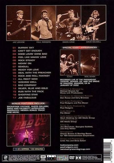 Recorded live at the Paramount Theatre, Denver, CO. and the Grove of Anaheim, Anaheim, CA in January of 20021. Burnin' Sky2. Can't Get Enough3. Good Lovin' Gone Bad4. Feel Like Makin' Love5. Rock Steady6. Movin' On7. Seagull8. Ready for Love9. Deal with the Preacher10. Rock and Roll Fantasy11. All Right Now12. Wishing Well13. Bad Company14. Silver, Blue and Gold15. Run with the Pack16. Shooting Star17. Joe Fabulous |