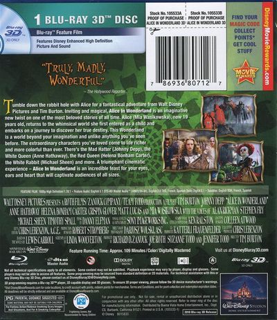 Tumble down the rabbit hole with Alice and see all your favorite characters leap off the screen and into your living room with this ultimate Combo Pack. It's the only way to experience the fantastical new adventure from Walt Disney Pictures and Tim Burton in full topsy-turvy 1080p Blu-ray 3D. Inviting and magical, Alice In Wonderland is an imaginative new twist on one of the most beloved stories of all time. Alice (Mia Wasikowska), now 19 years old, returns to the whimsical world she first entered as a child and embarks on a journey to discover her true destiny. It's a Wonderland beyond your imagination, where the extraordinary characters you've loved come to life richer and more colorful than ever. There's the Mad Hatter (Johnny Depp), the White Queen (Anne Hathaway), the Red Queen (Helena Bonham Carter), the White Rabbit (Michael Sheen) and more. A triumphant cinematic experience - Alice In Wonderland is an incredible feast for your eyes, ears and heart that will captivate audiences of all sizes, especially in Disney 3D - Magic In A New Dimension. |