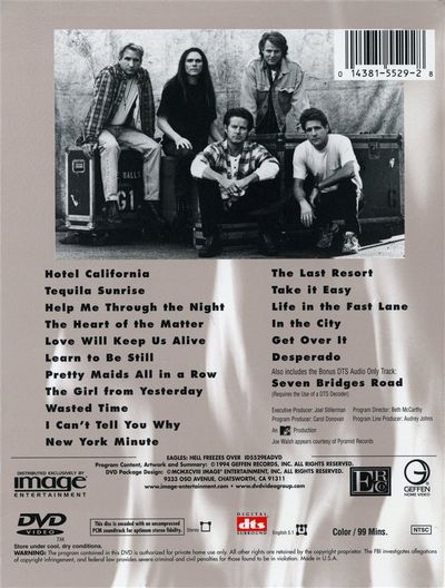 The Eagles perform in concert, in celebration of the group's reunion, which was supposed to occur "when hell freezes over."1. Hotel California2. Tequila Sunrise3. Help Me Through the Night4. The Heart of the Matter5. Love Will Keep Us Alive6. Learn to be Still7. Pretty Maids All in a Row8. The Girl from Yesterday9. Wasted Time10. I Can't Tell You Why11. New York Minute12. The Last Resort13. Take it Easy14. Life in the Fast Lane15. In the City16. Get Over 17 DesperadoAlso Includes the Bonus DTS Audio Only Track: Seven Bridges Road |