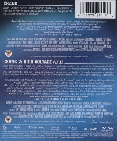 CrankThere are a thousand ways to raise your adrenaline, and today hit many Chev Chelios (Jason Statham) will need every one! He has one hour to settle the score and say good-bye to his girl and go out with a little style! The only question is, will he stay alive long enough to see it happen?Crank 2: High Voltage' You can't keep a good man down. Jason Statham is back as Chev Chelios - this time to retrieve his stolen heart (that's right, he's running on battery power). High-octane and truly electrifying! |