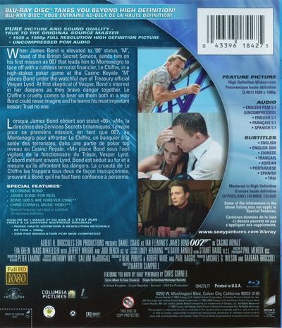 When James Bond is elevated to “00” status, “M”, head of the British Secret Service, sends him on his first mission as 007 that leads him to Montenegro to face off with a ruthless terrorist financier, Le Chiffre, in a high-stakes poker game at the Casino Royale. 'M' places Bond under the watchful eye of Treasury official Vesper Lynd. At first skeptical of Vesper, Bond's interest in her deepens as they brave danger together. Le Chiffre's cruelty comes to bear on them both in a way Bond could never imagine and he learns his most important lesson: Trust no one. Lorsque James Bond obtient son statut «00», «M» la directrice des Service Secrets britanniques, l’envoie pour sa première mission, en tant que 007, au Montenegro pour affronter Le Chiffre, un banquier à la solde des terroristes, dans une partie de poker top niveau au Casino Royale. «M» place Bond sous l’oeil vigilant de la fonctionnaire du Trésor, Vesper Lynd. D’abord méfiant envers Lynd, Bond est séduit au fur et à mesure qu’ils affrontent les dangers. La cruauté de Le Chiffre les frappera tous deux de façon insoupçonnée prouvant à Bond: qu’il ne faut faire confiance à personne.