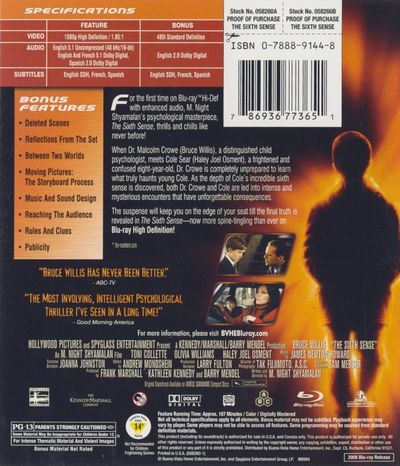 For the first time on Blu-ray Hi-Def with enhanced audio, M. Night Shyamalan's psychological masterpiece, The Sixth Sense, thrills and chills like never before! When Dr. Malcolm Crowe ( Bruce Willis), a distinguished child psychologist, meets Cole Sear (Haley Joel Osment), a frightened and confused eight-year-old...Dr. Crowe is completely unprepared to learn the truth of what haunts young Cole. With a riveting intensity you'll find thoroughly chilling and utterly unforgettable, this discovery of Cole's incredible 6th sense leads them both to mysterious and unforeseeable consequences! The suspense will keep you on the edge of your seat till the final truth is revealed in The Sixth Sense - now more spine tingling than ever on Blu-ray High Definition! |