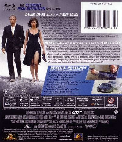 On a nonstop quest for justice that crisscrosses the globe. Bond meets the beautiful but feisty Camille (Olga Kurylenko), who leads him to Dominic Greene (Mathieu Amalric), a ruthless businessman and major force within the mysterious Quantum organisation. When Bond uncovers a conspiracy to take control of one of the world's most important natural resources, he must navigate a minefield of treachery, deception and murder to neutralise Quantum before it's too late!---Plongé dans une quête de justice sans répit, Bond sillonne le globe en tous sens avant de rencontrer la superbe et impétueuse Camille (Olga Kurylenko), qui le conduit à Dominic Greene (Mathieu Amalric), un homme d'affaires impitoyable ainsi qu'une force de premier plan au sein de la mystérieuse organisation Quantum. Lorsque Bond découvre l'existence d'une conspiration visant à prendre le contrôle d'une des plus importantes ressources naturelles de la planète, il doit faire face à un cocktail explosif de traîtrise, de duperie et de meurtre pour neutraliser Quantum avant qu'il ne soit trop tard !