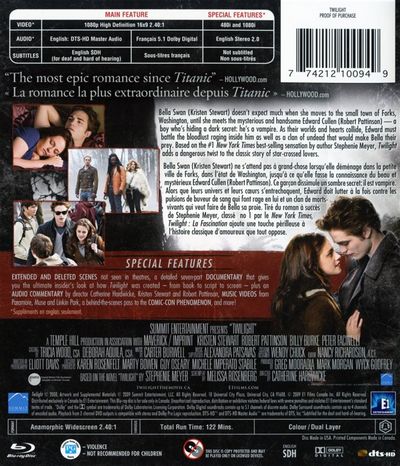 Bella Swan (Kristen Stewart) doesn't expect much when she moves to the small town of Forks, Washington, until she meets the mysterious and handsome Edward Cullen (Robert Pattinson) - a boy who's hiding a dark secret: he's a vampire. As their worlds and hearts collide, Edward must battle the bloodlust raging inside him as well as a clan of undead that would make Bella their prey. Based on the #1 New York Times best-selling sensation by author Stephenie Meyer, Twilight adds a dangerous twist to the classic story of star-crossed lovers.Bella Swan (Kristen Stewart) ne s’attend pas à grand-chose lorsqu’elle déménage dans la petite ville de Forks, dans l’état de Washington, jusqu’à ce qu’elle fasse la connaissance du beau et mystérieux Edward Cullen (Robert Pattinson). Ce garçon dissimule un sombre secret : il est vampire. Alors que leurs univers et leur cœurs s’entrechoquent, Edward doit lutter à la fois contre les pulsions de buveur de sang qui font rage en lui et un clan de mort-vivants qui veut faire de Bella sa proie. Tiré du roman à succès de Stephenie Meyer, classé no 1 par le New York Times, Twilight : La Fascination ajoute une touche périlleuse à l’histoire classique d’amoureux que tout oppose. |