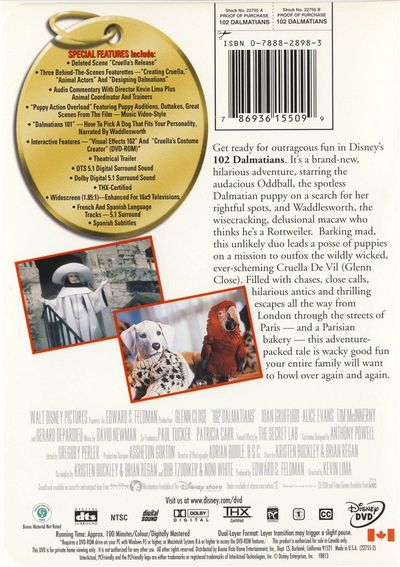 Get ready for outrageous fun in Disney's 102 Dalmatians. It's a brand-new, hilarious adventure, starring the audacious Oddball, the spotless Dalmatian puppy on a search for her rightful spots, and Waddlesworth, the wisecracking, delusional macaw who thinks he's a Rottweiler. Barking mad, this unlikely duo leads a posse of puppies on a mission to outfox the wildly wicked, ever-scheming Cruella De Vil (Glenn Close). Filled with chases, close calls, hilarious antics and thrilling escapes all the way from London through the streets of Paris -- and a Parisian bakery -- this adventure-packed tale is wacky good fun your entire family will want to howl over again and again. |