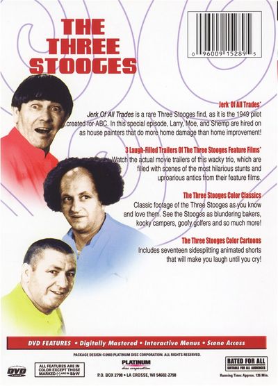 JERK OF ALL TRADESJerk of All Trades is a rare Three Stooges find, as it is the 1949 pilot created for ABC. In this special episode, Larry, Moe, and Shemp are hired on as house painters that do more home damage than home improvement!3 LAUGH-FILLED TRAILERS OF THE THREE STOOGES FEATURE FILMSWatch the actual movie trailers of this wacky trio, which are filled with scenes of the most hilarious stunts and uproarious antics from their feature films.THE THREE STOOGES COLOR CLASSICSClassic footage of the Three Stooges as you know and love them. See the Stooges as blundering bakers, kooky campers, and so much more!THE THREE STOOGES COLOR CARTOONSIncludes seventeen sidesplitting animated shorts that will make you laugh until you cry!
