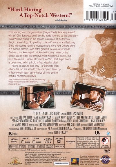 "The leading icon of a generation" (Roger Ebert), Academy Award® winner Clint Eastwood continues his trademark role as the legendary "Man with No Name" in this second installment of the famous Segio Leone trilogy. Scripted by Luciano Vincenzoni and featuring Ennio Morricone's haunting musical score, 'For a Few Dollars More' is a modern classic - one of the greatest westerns ever made. Eastwood is a keen-eyed quick-witted bounty hunter on the bloody trail of Indio, the territory's most treacherous bandit. But his ruthless rival, Colonel Mortimer (Lee Van Cleef, 'High Noon'), is determined to bring Indio in first... dead or alive! Failing to capture their prey - or eliminate each other- the two are left with only one option: team up, or face certain death at the hands of Indio and his band of muderous outlaws. |
