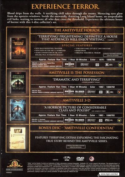 Experience TerrorBlood drips from the walls. A terrifying chill rakes through the rooms. Menacing eyes glow from the upstairs window. Inside the outwardly charming Long Island home, an unspeakable evil lurks, waiting to torment all who dare cross the threshold. Experience the ultimate house of horror with this 4 disc collector's set. Includes:The Amityville Horror Amityville II: The Possession Amityville 3-DAmityville Confidential |