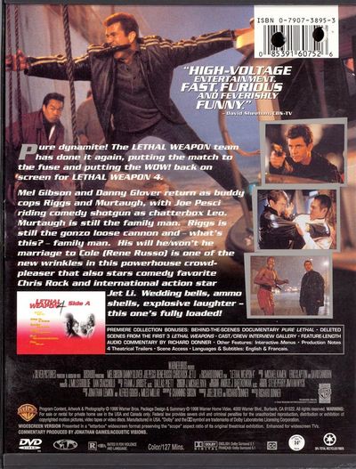 Pure dynamite! The LETHAL WEAPON team has done it again, putting the match to the fse and putting the WOW! back on the screen for LETHAL WEAPON 4.Mel Gibson and Danny Glove return as buddy cops Riggs and Murtaugh, with Joe Pesci riding comedy shotgun as chatterbox Leo. Murtaugh is still the family man. Riggs is still the gonzo loose cannon and - what's this? - family man. His will he/won't he marriage to Cole (Renee Russo) is one of the new wrinkles in this powerhouse crowdpleaser that also stars comedy favorite Chris Rock and international action star Jet Li. Wedding bells, ammo shells, explosive laughter - this one's fully loaded! |