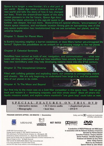 Space is no longer a new frontier. It's a vital part of our world. Space Age takes a close-up view of that new world and tells the story of how it has changed our lives. From the dream driven hopes of the early rocket pioneers to the far future, Space Age documents the latest advances in the age-old quest to go further, see deeper, and find out more. State-of-the-art special effects, "pre-creations" of future space missions, and worldwide location filming give each fascinating program in the series an eye-opening view of the way space exploration has revolutionized how we see ourselves, our planet, and the universe beyond