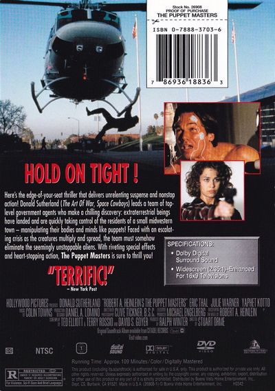 Here's the edge-of-your-seat thriller that delivers unrelenting suspense and nonstop action! Donald Sutherland (The Art Of War, Space Cowboys) leads a team of top-level government agents who make a chilling discovery: extraterrestrial beings have landed and are quickly taking control of the residents of a small midwestern town – manipulating their bodies and minds like puppets! Faced with an escalating crisis as the creatures multiply and spread, the team must somehow eliminate the seemingly unstoppable aliens. With riveting special effects and heart-stopping action, The Puppet Masters is sure to thrill you! |